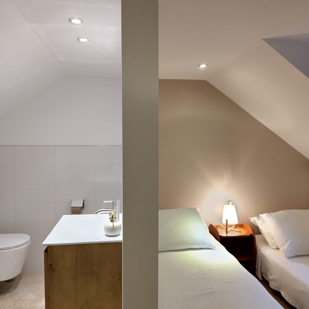 - Bedrooms 3 & 4 offer two single beds and a private bathroom with a vanity unit and toilet.